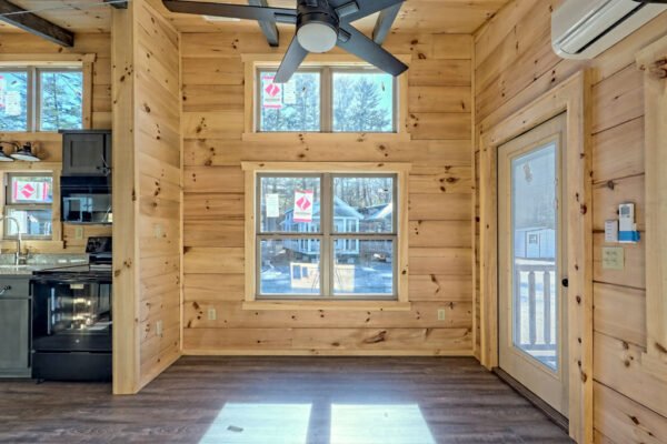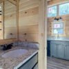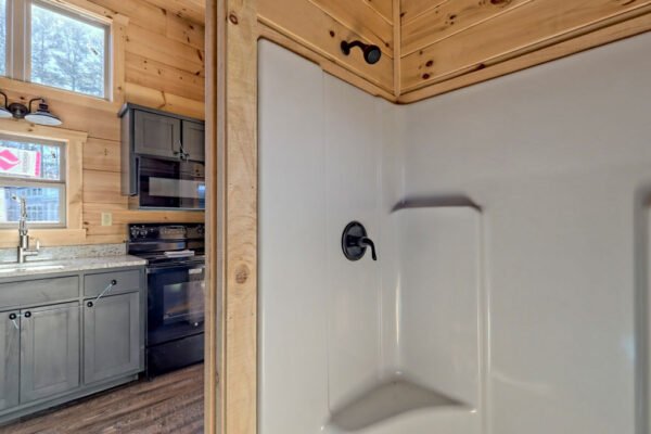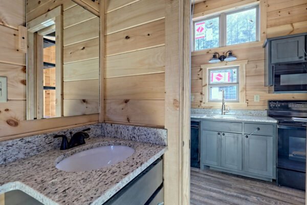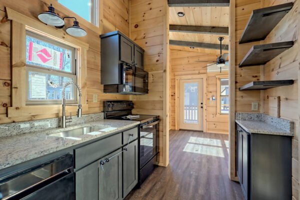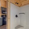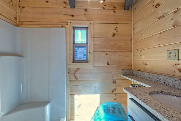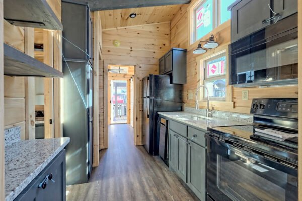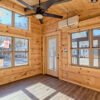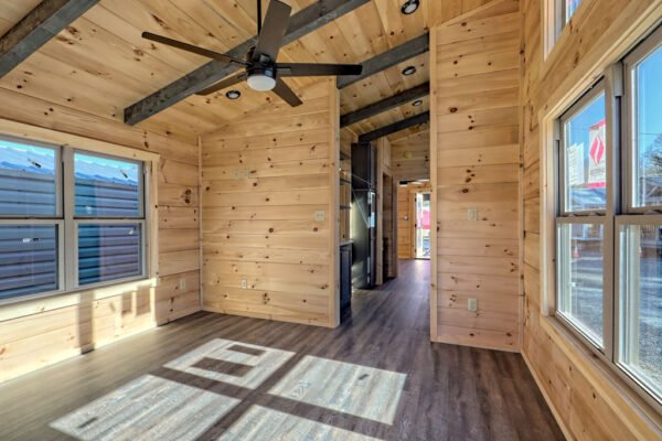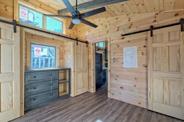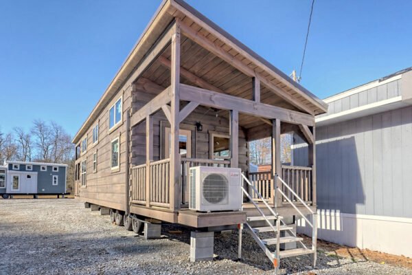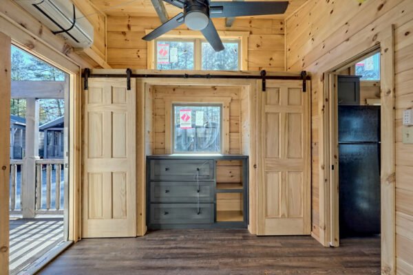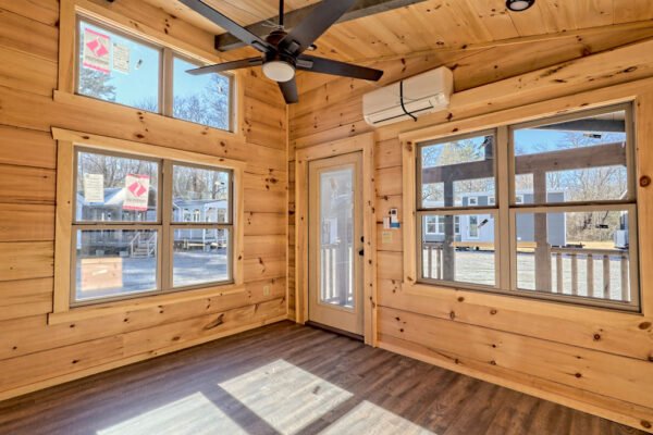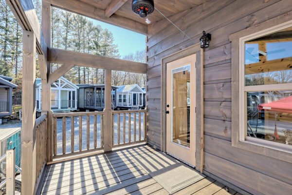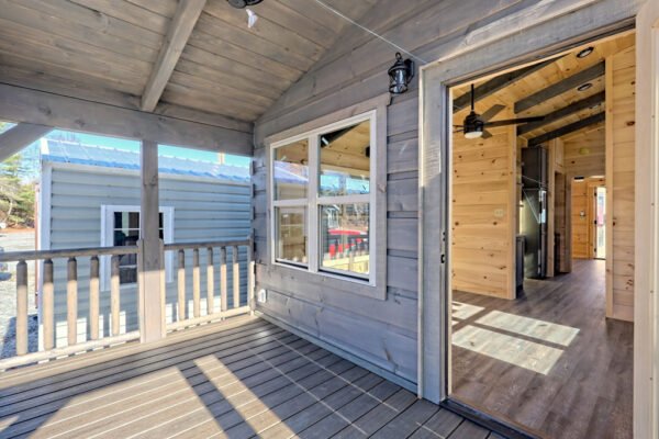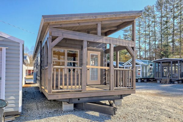 The Maddox model tiny home is a 396 square feet, 13′ x 47′, 1 bedroom, 1 bath RV park model that comfortably sleeps 4 people and is available with real log or lap siding. The bedroom has build-in storage options as well as an additional exterior door leading to the second porch with ceiling fans. As well as the standard features included in all of our Tiny Life Homes brand, the Maddox can be further customized beyond what is shown. Be sure to ask our Sales Team and we will try to accommodate your requests!
