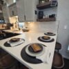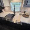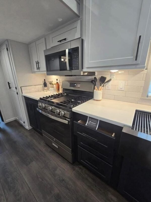 • Full Kitchen: Spacious countertops, farmhouse sink, black appliances